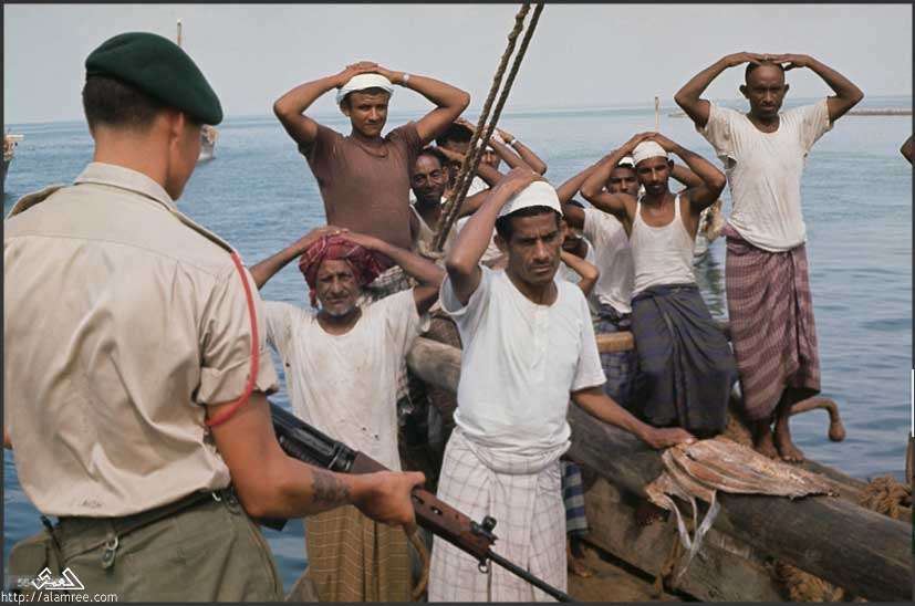 جندي بريطاني شاهرا مسدسه على البحاره |