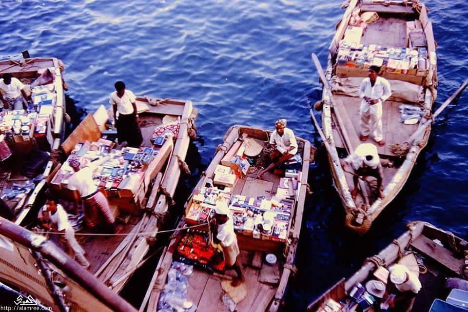 التواهي دكه البينو ويلاحظ صنادل نقل البضائع راسيه ويتم افراغ البضائع الى