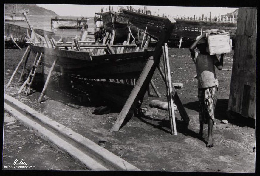 المعلا والعديد من السفن الشراعيه التي تصنع هناك وفي الخلفية جبل حديد