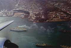 ميناء المعلا مركز صناعة السفن الشراعية وفي الخلفيه جزيرة العبيد
