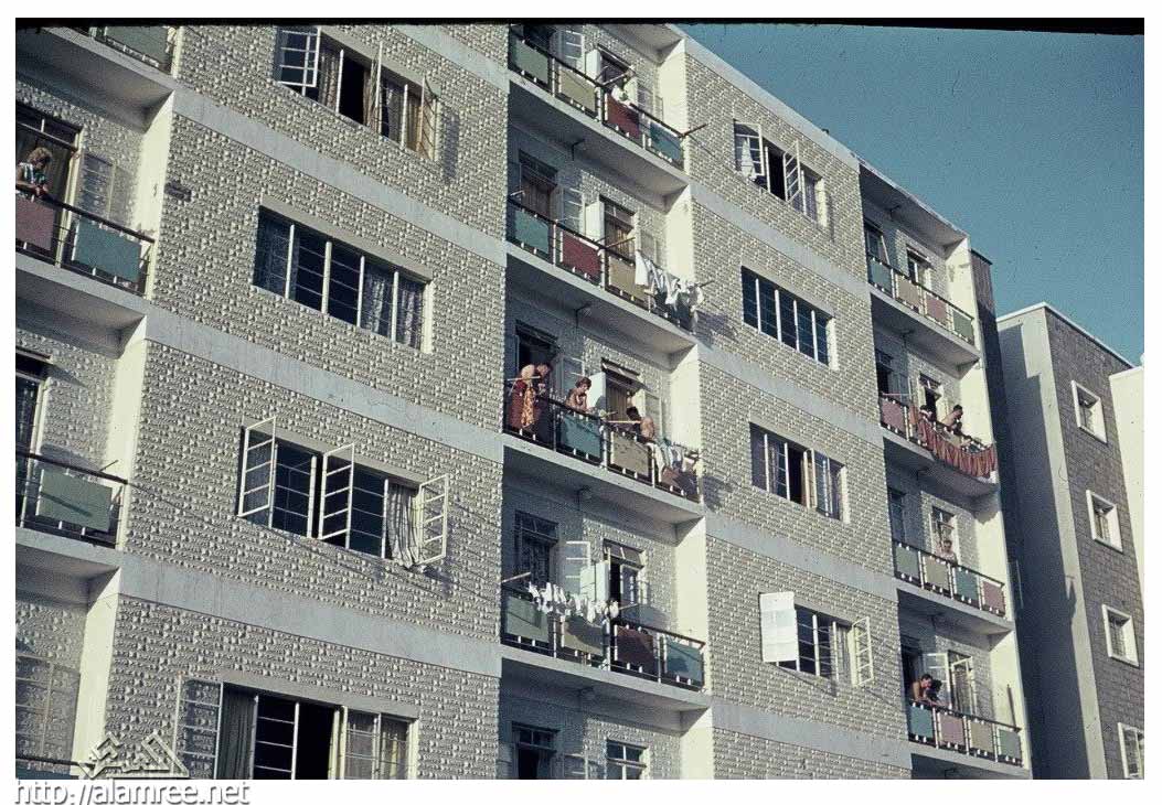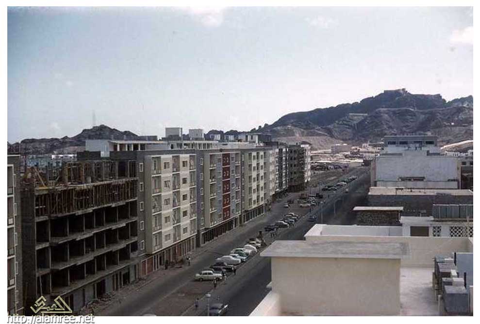 انقر للحصول على حجم اكبر المعلا الشارع الرئيسي بداية الستينات واحدى العمارات التي تبنى لسكن عائلات العسكريين البريطانيين وموطفيه من الانجليز