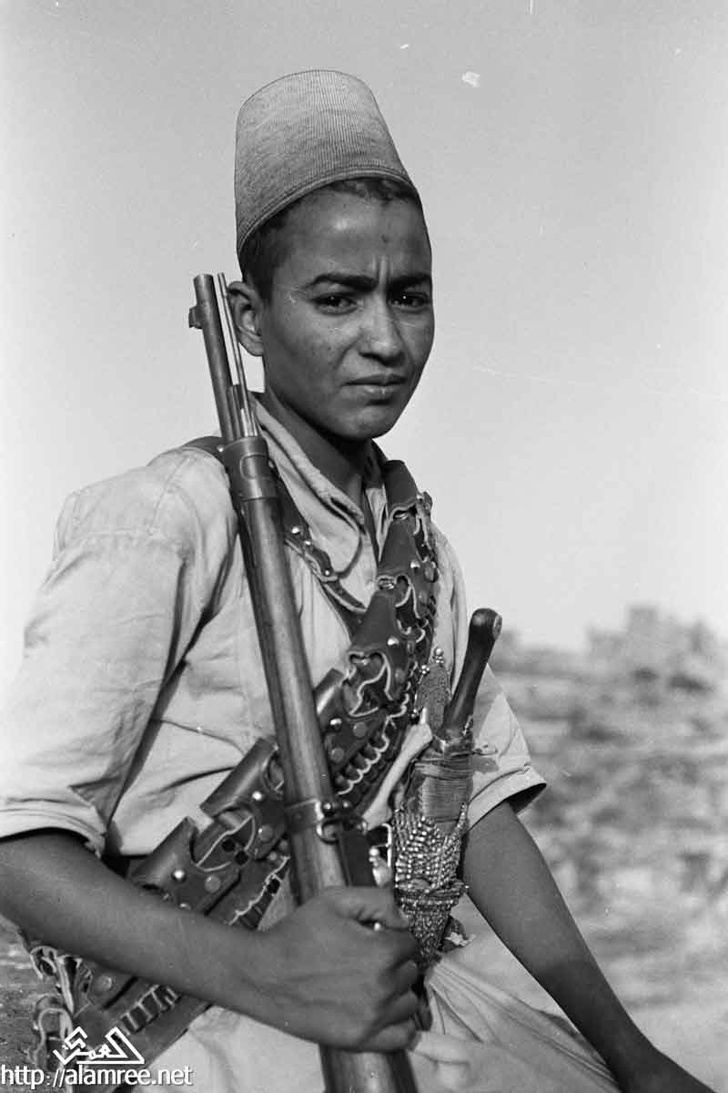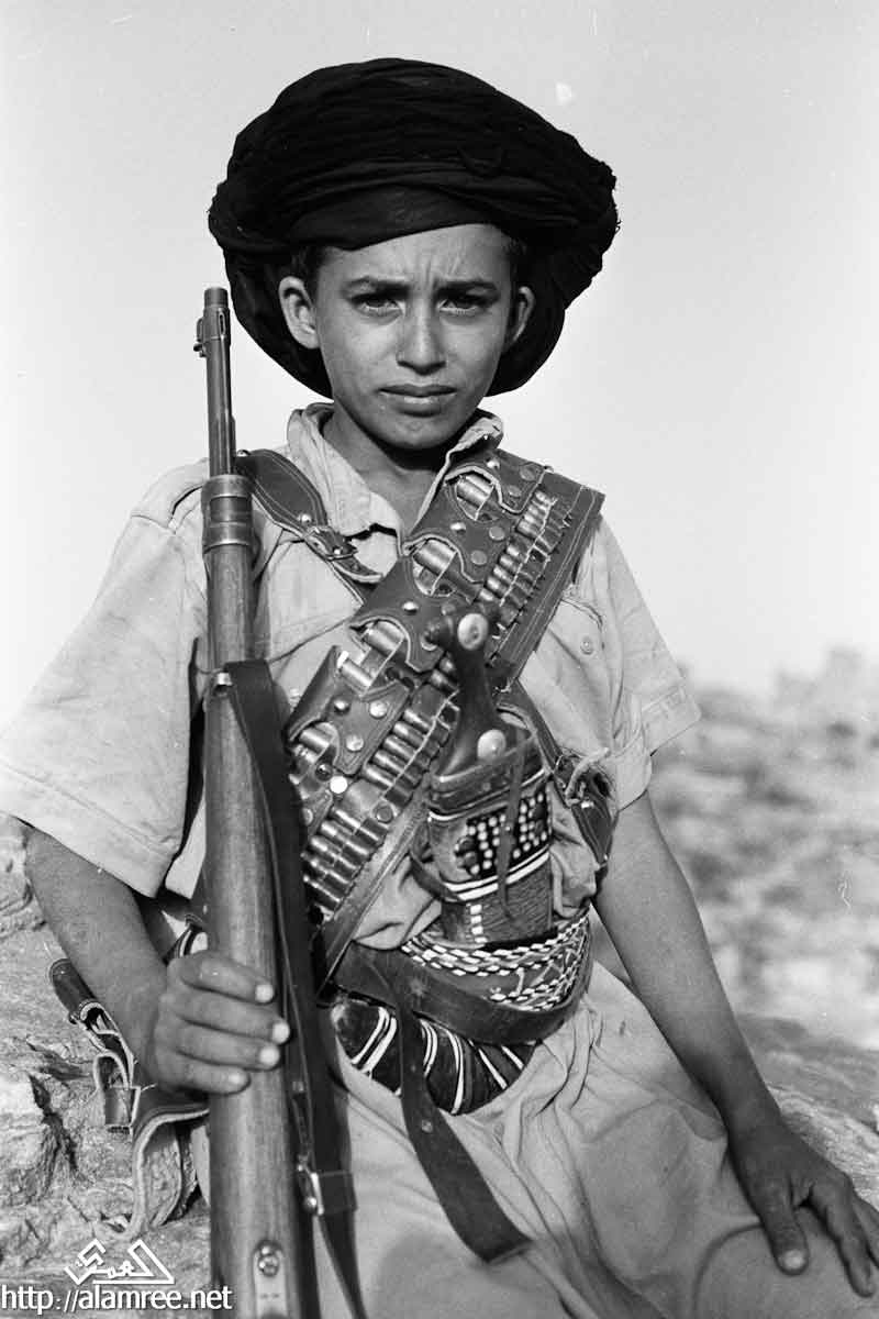 صورة لطفل يحمل بندقية كبيرة ويرتدي الماندولير حول صدره وخنجرا في حزامه