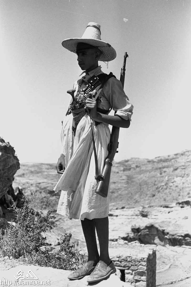 صبي يحمل بندقية كبيرة ويرتدي الماندولير حول صدره وخنجرا في حزامه