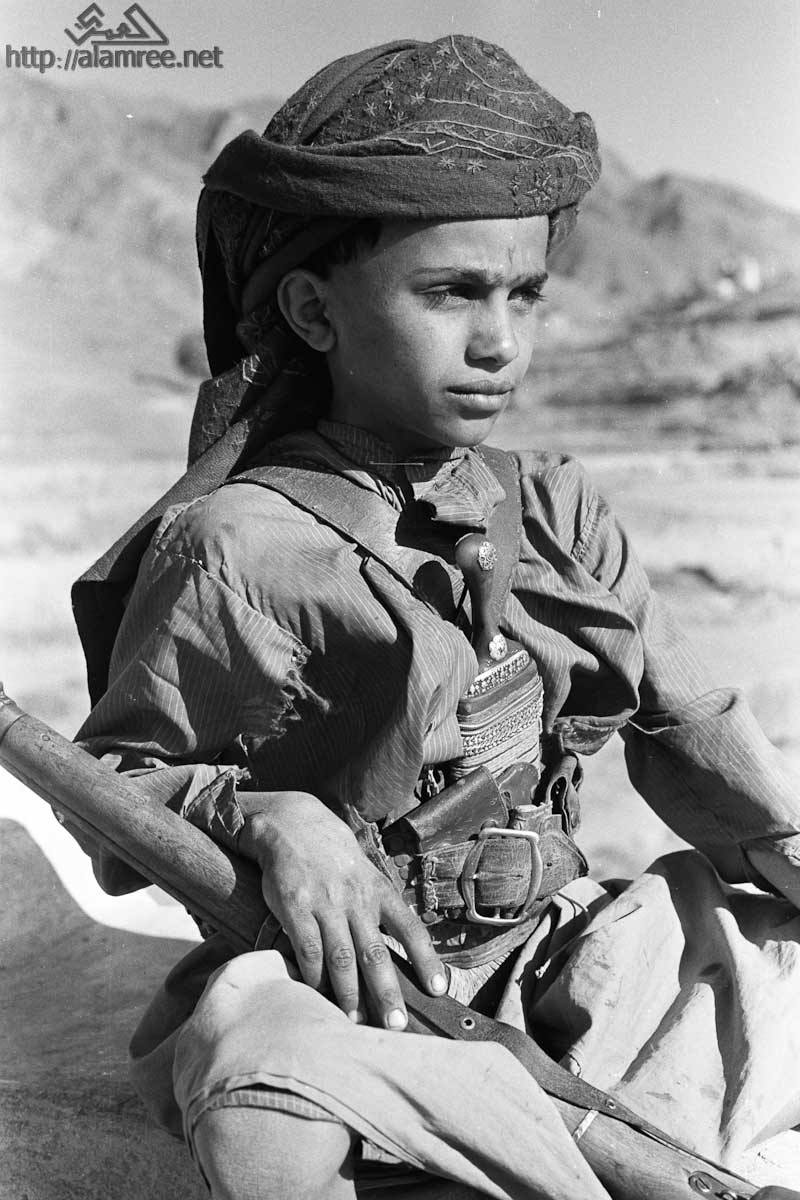 صورة لصبي صغير بخنجر مغمد في حزامه وممسكا ببندقية