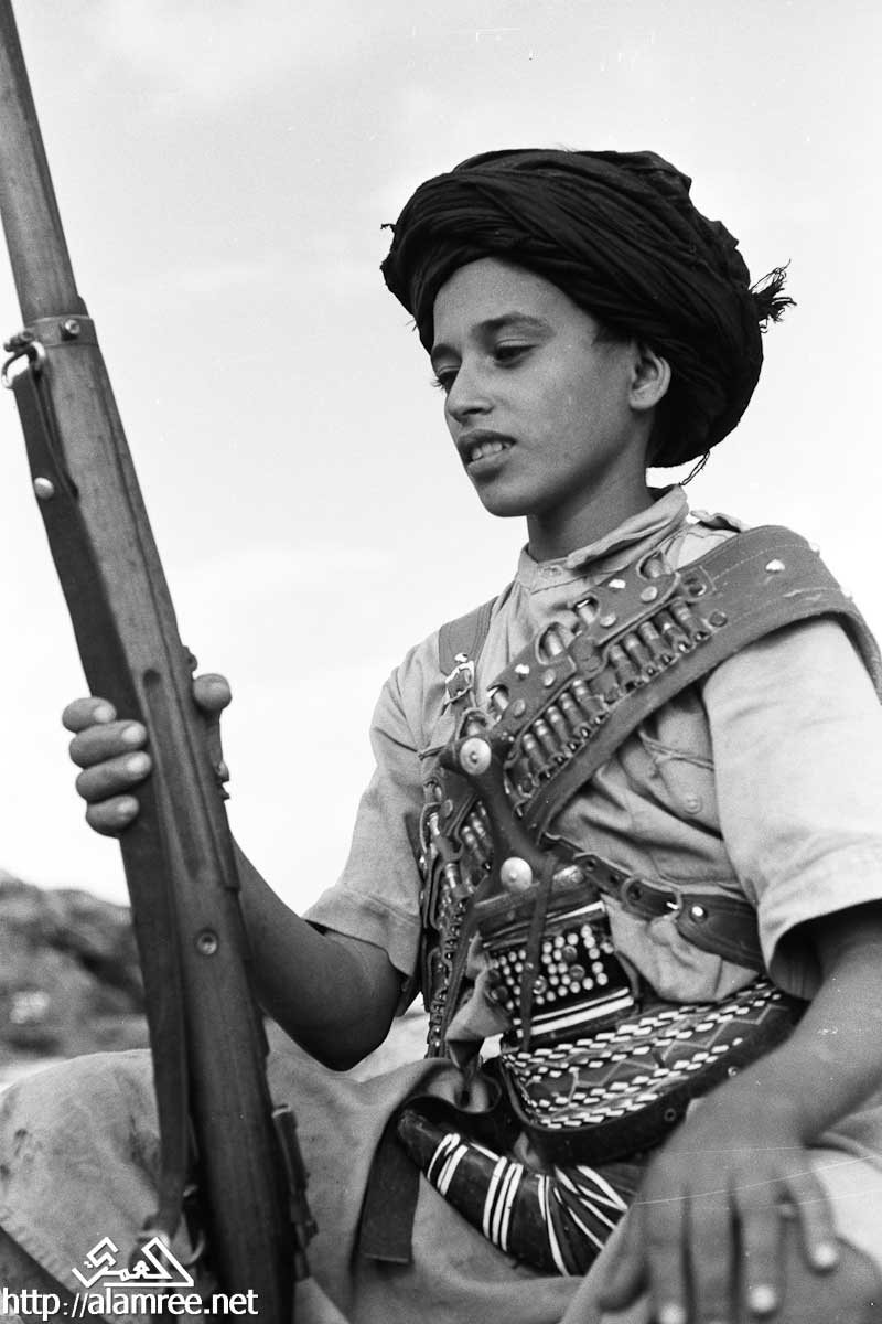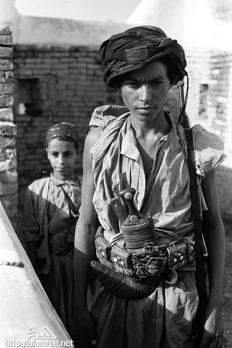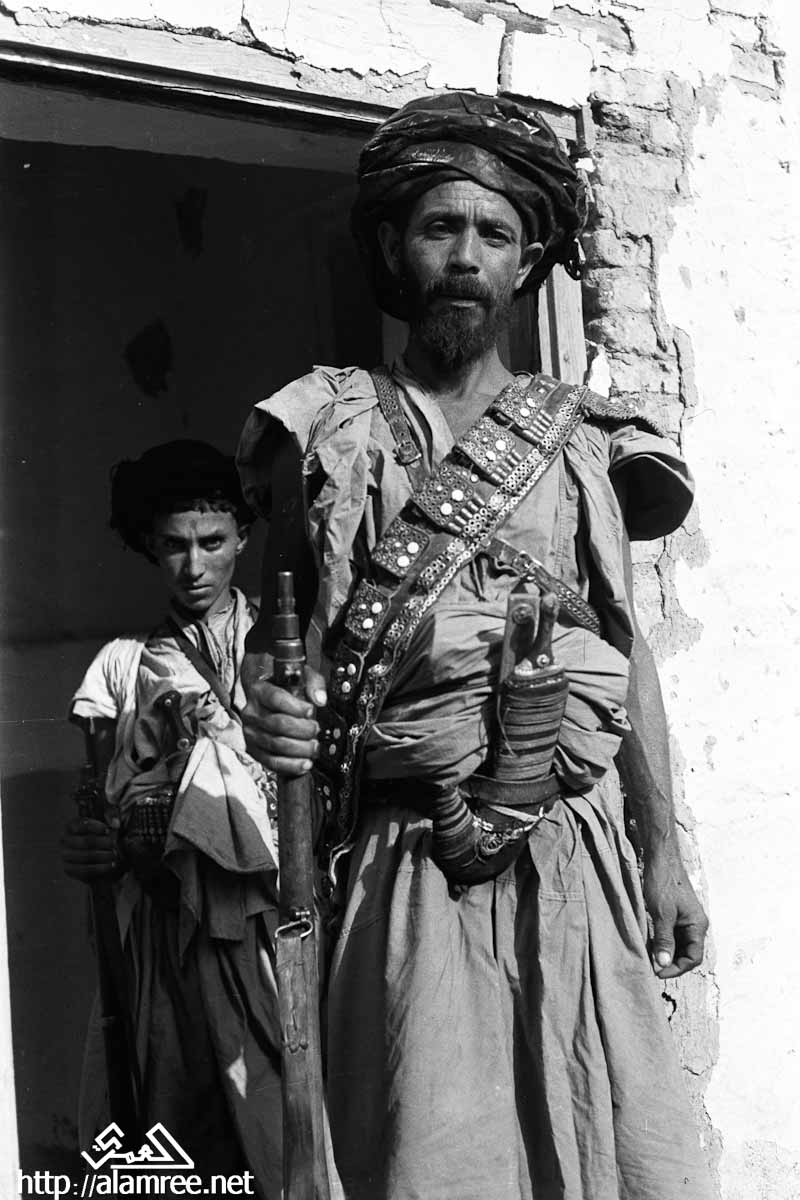 صورة لرجل، وهو جندي من قوات الملكيين، واقفا في المدخل، مرتديا خنجر في غمد على وسطه، وممسكا ببندقية في يده اليمنى، مع شاب يقف وراءه، وعقد أيضا بندقية.