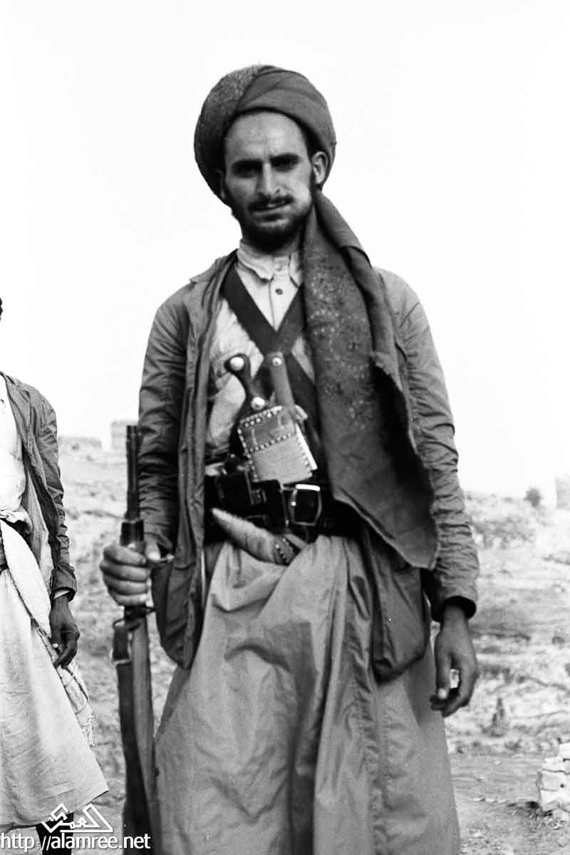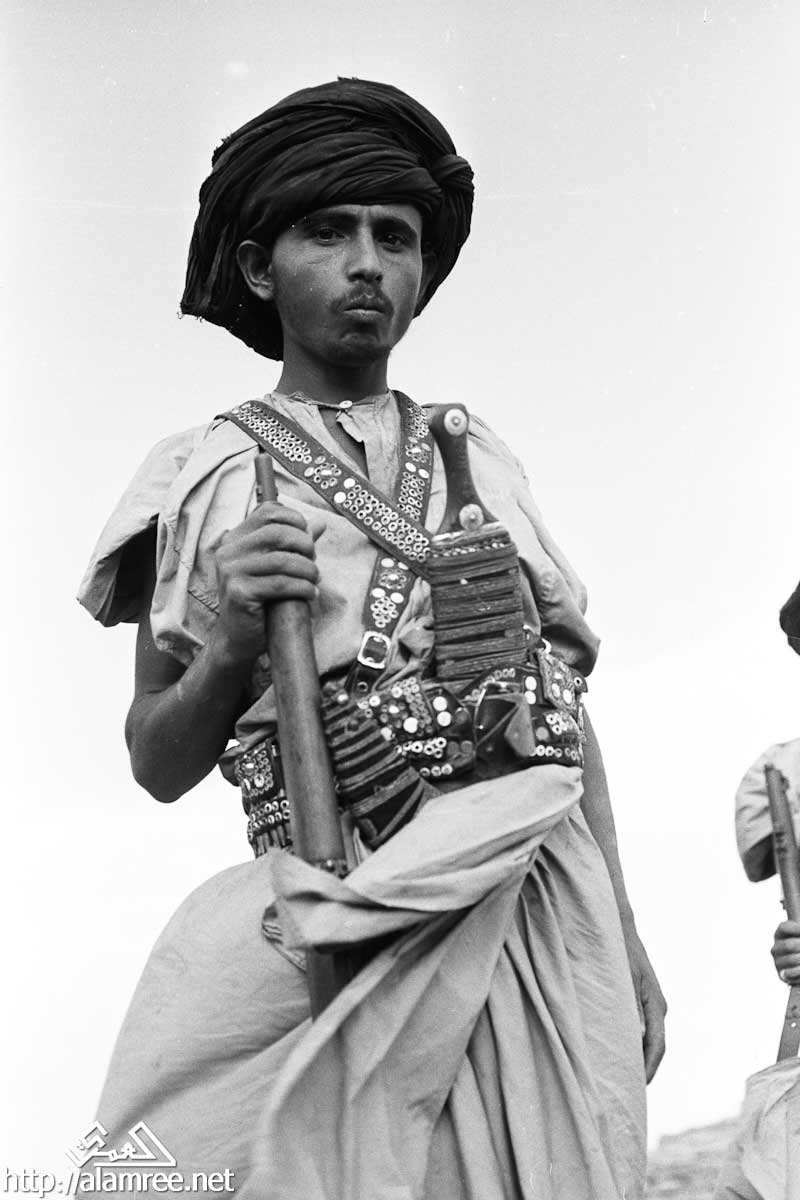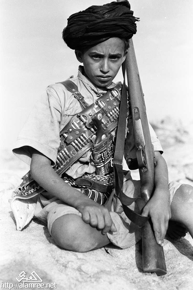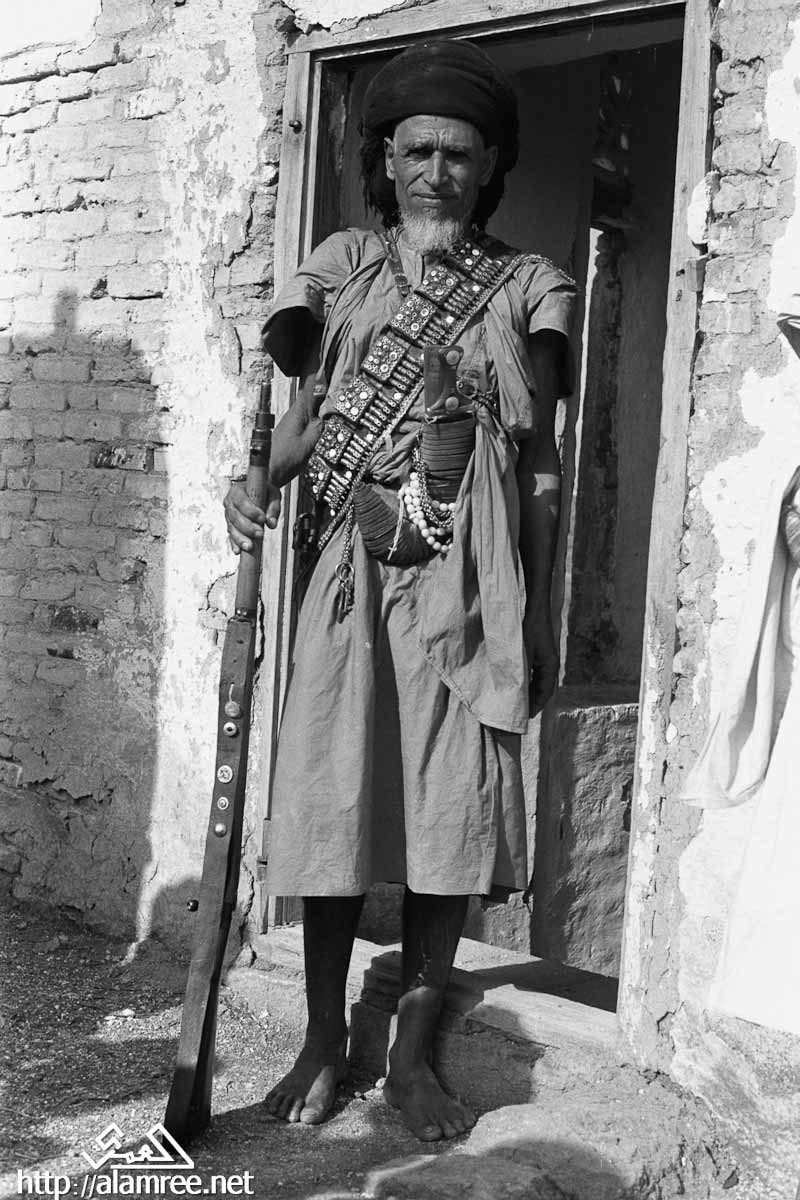 صورة لرجل، وهو جندي من قوات الملكيين، واقفا في المدخل، مرتديا خنجر في غمد على وسطه، وممسكا ببندقية في يده اليمنى، مع شاب يقف وراءه، وعقد أيضا بندقية.
