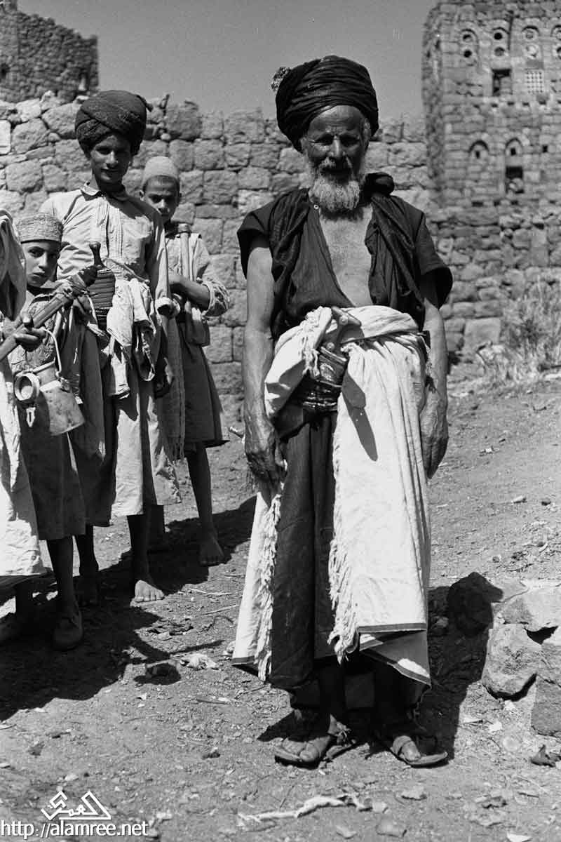 صورة لرجل عجوز يرتدي الخنجر في حزامه. هناك شبان والبنين في الخلفية