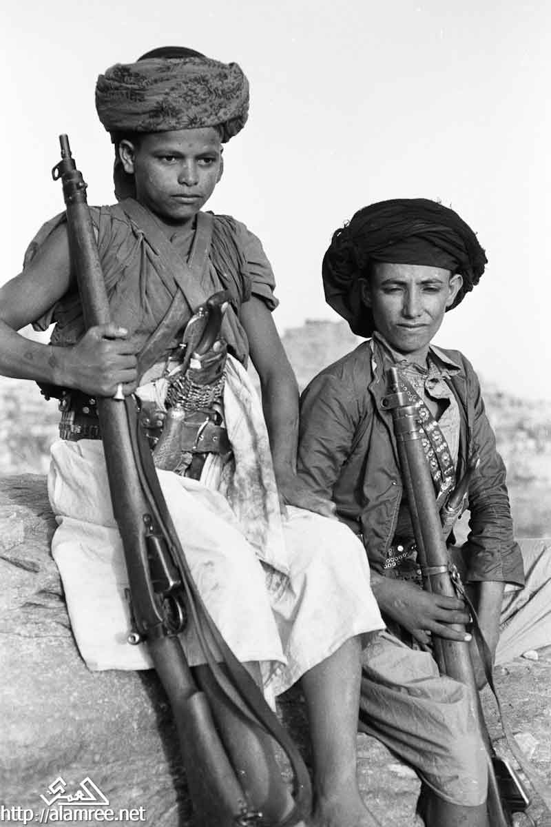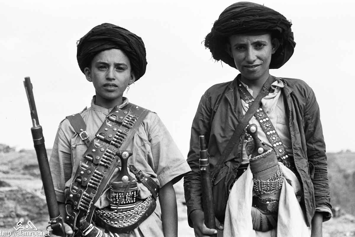 صورة لشاب وفتى. لديهم بندقية كبيرة وارتداء حمالات حول صدورهم ويكون الخناجر في أحزمتهم