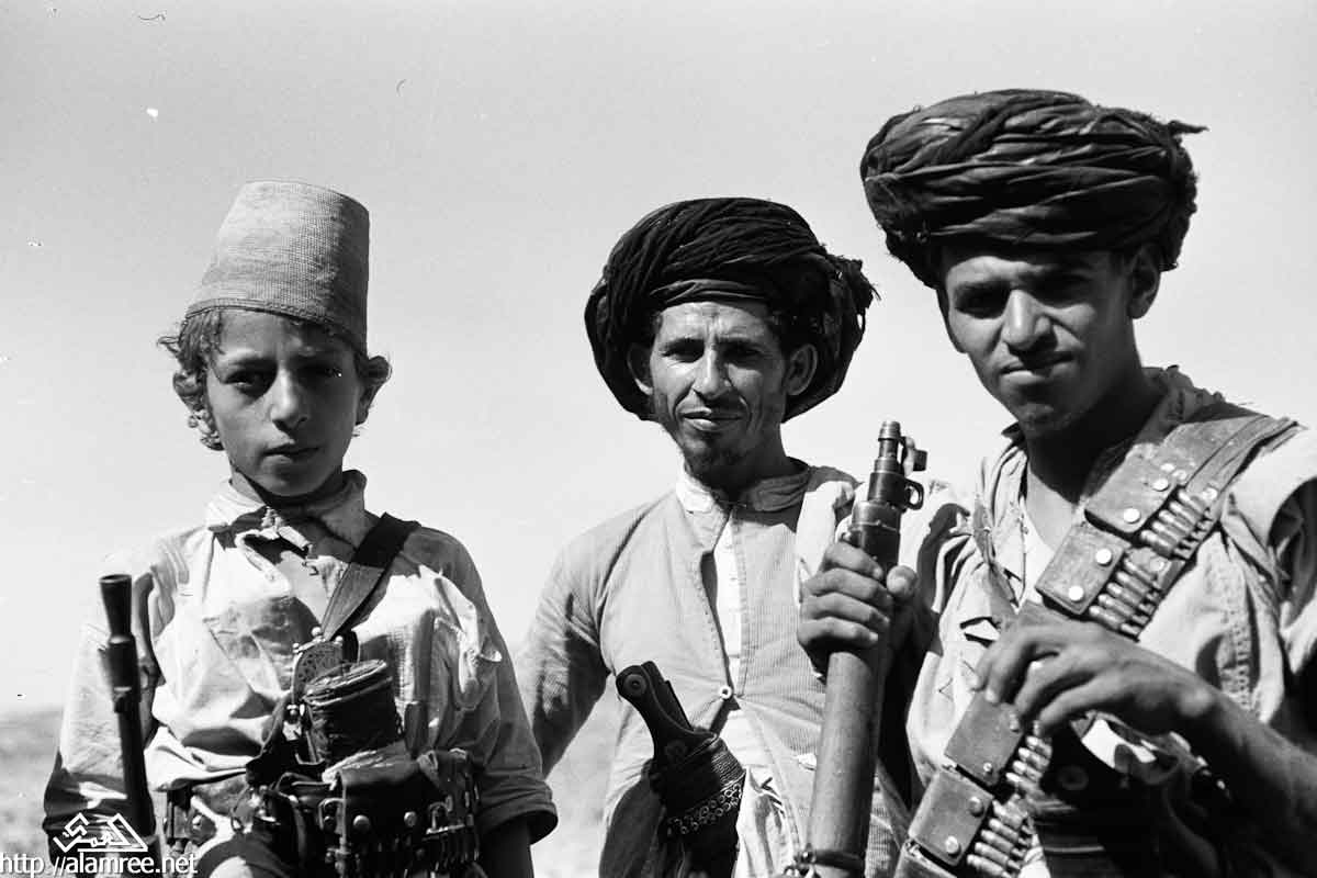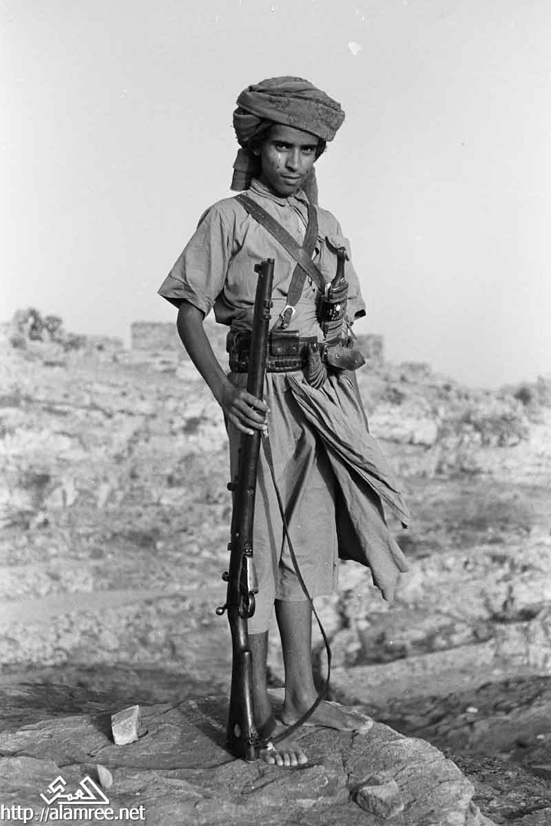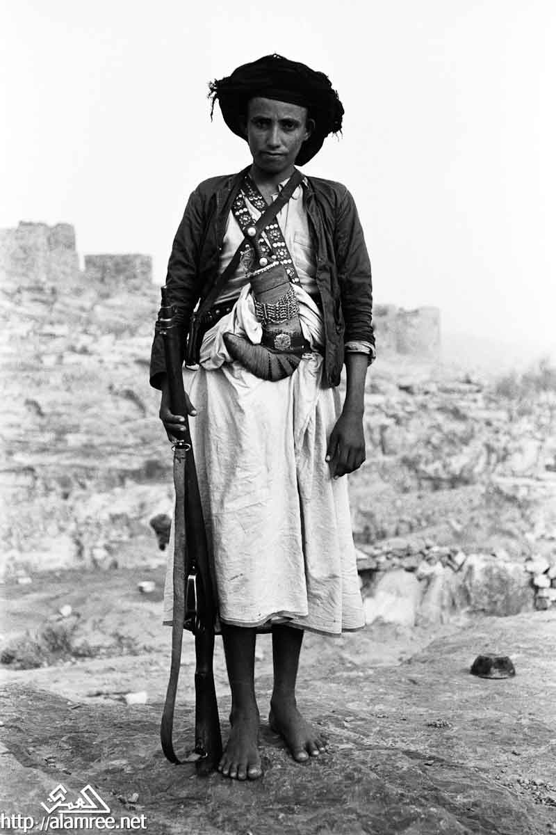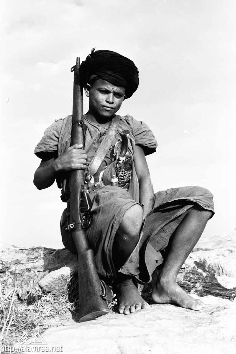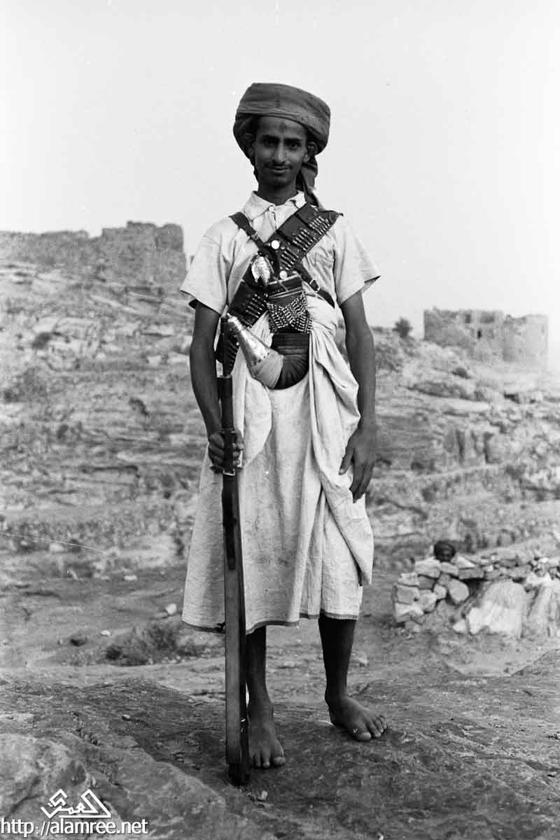 صورة لشاب يحمل بندقية كبيرة ويرتدي الماندولير حول صدره وخنجرا في حزامه.