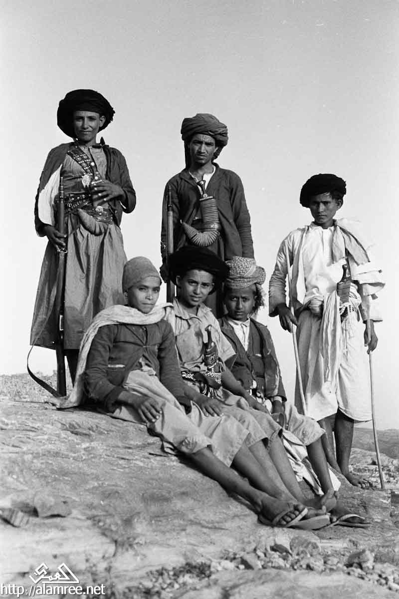 صورة لمجموعة من الشباب الجلوس وقفت على بعض الصخور. انهم مسلحون بالبنادق والخناجر مغمد
