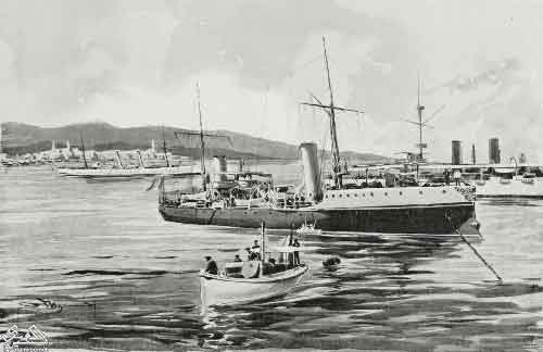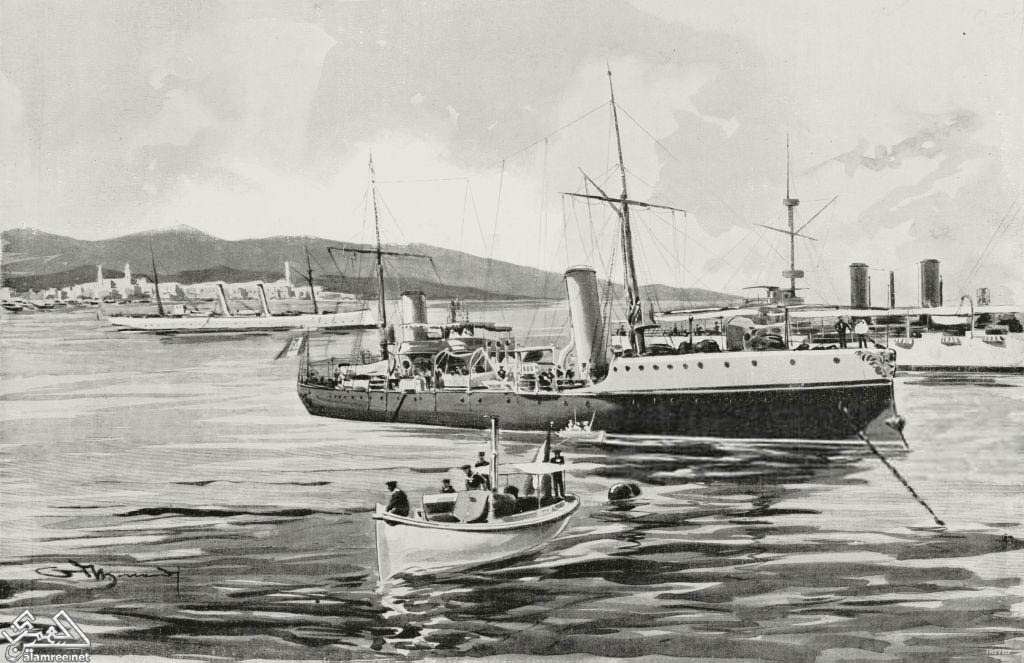 طوربيد قارب بيدمونت في ميناء الحديدة أثناء مطاردة القراصنة على الساحل ، اليمن ، رسم ادريانو ميناردي ، من ليلوسترازيون إيطاليانا ، السنة التاسعة والعشرون ، رقم 45 ، 9 نوفمبر ، 1902 |