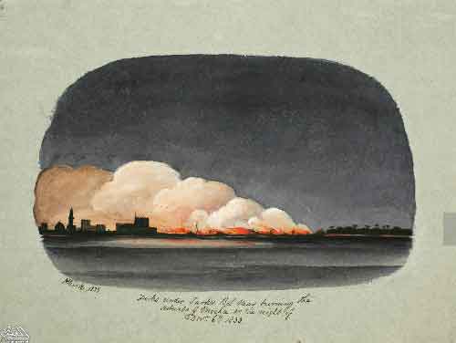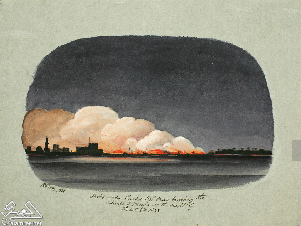 لأتراك تحت قيادة التركى بيل ماس يحرقون ضواحى المخاء ليلة السادس من ديسمبر عام 1833 |