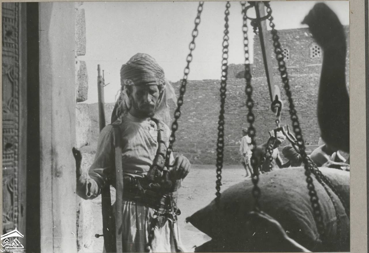 مسؤولون يمنيون جنوبيون على متن السفينة "المطيرية". لاحظ العمائم ذات الطراز الهندي والخنجر المحاط بالمسبحة. عمر بحر على متن المسترية