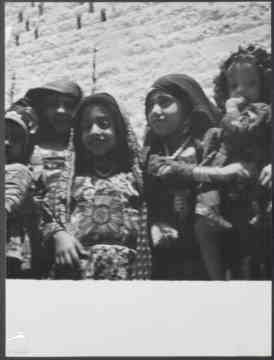 اليمن. زبيد. ['طفلات أمام مبنى؟ الواجهة بيضاء ومزينة بنقوش بارزة].