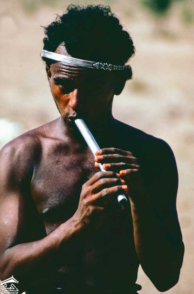 رجل يمني من قبيلة الزرانيق يعزف على الناي المسمى الشبابة أو القصبة في
