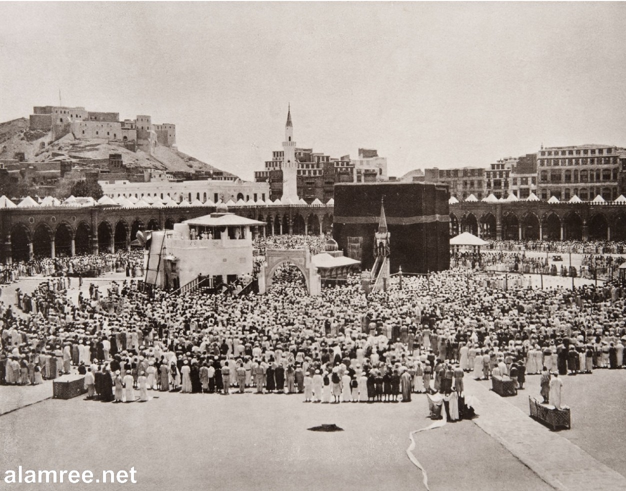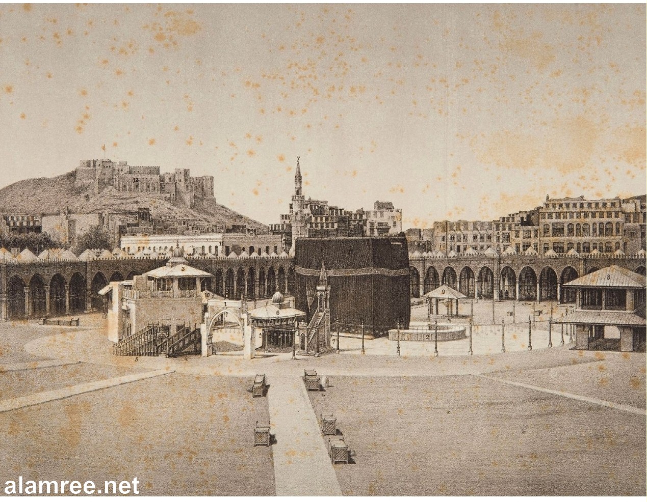 المشهد الأول لمدينة مكة: يسارًا في الخلفية قلعة أجياد. المبنى الكبير ناحية اليمين هو الحامدية، والمطبعة على يساره.تظهر