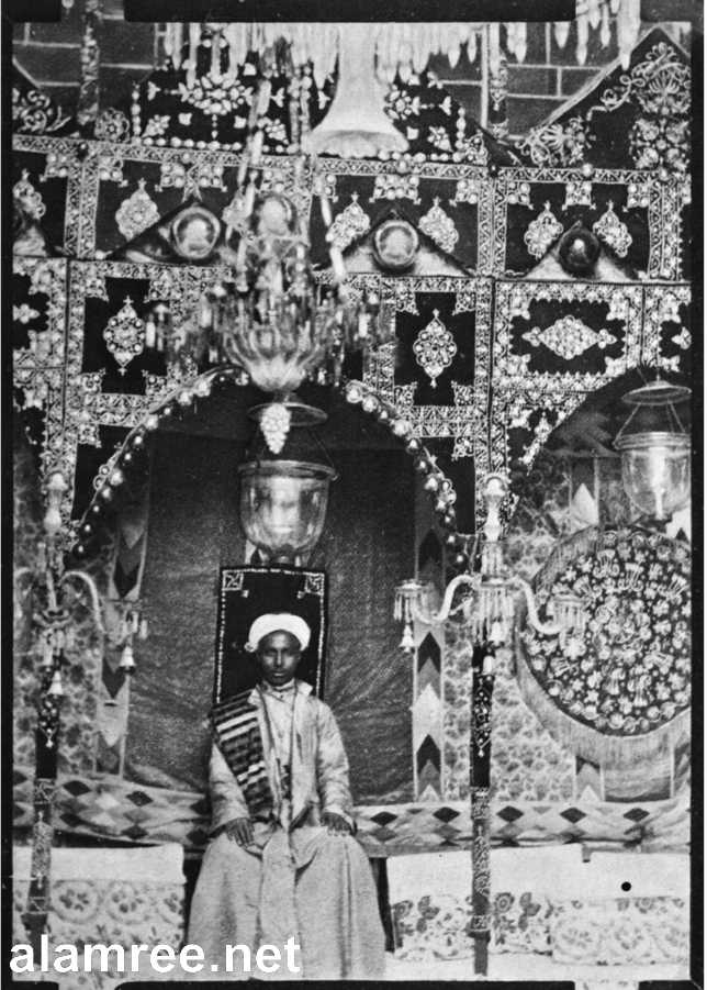 إبل الركوب (الهجين) للشريف يحيى، ابن الشريف أحمد، الذي كان أبوه الشريف الكبير عبد المطلب الذي توفي في ١٨٨٦ (قارن بشأن آخر ملوك مكة من العهد القديم، 'مكة'، مجلد I، صص.١٦، صص.١٧٤)، مع قماش للسرج غني بتطريز الفضة. يمسك باللجام عبد مملوك ليحيى؛ ويقف يحيى بجانبه برداء الركوب ويسارًا يقف شريفان بدرجة أقل مرتديان ملابس طويلة." تصوير: السيد عبد الغفّار.
