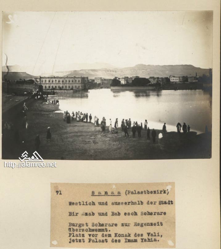 ![]() صنعاء منطقة القصر الجهه الغربية خارج المدينة ـ بير العزب و باب الشرارة الذي تغمره المياه في موسم الأمطار الميدان أمام مقر الوالي ، قصر الإمام يحي بداية القرن الماضيم |