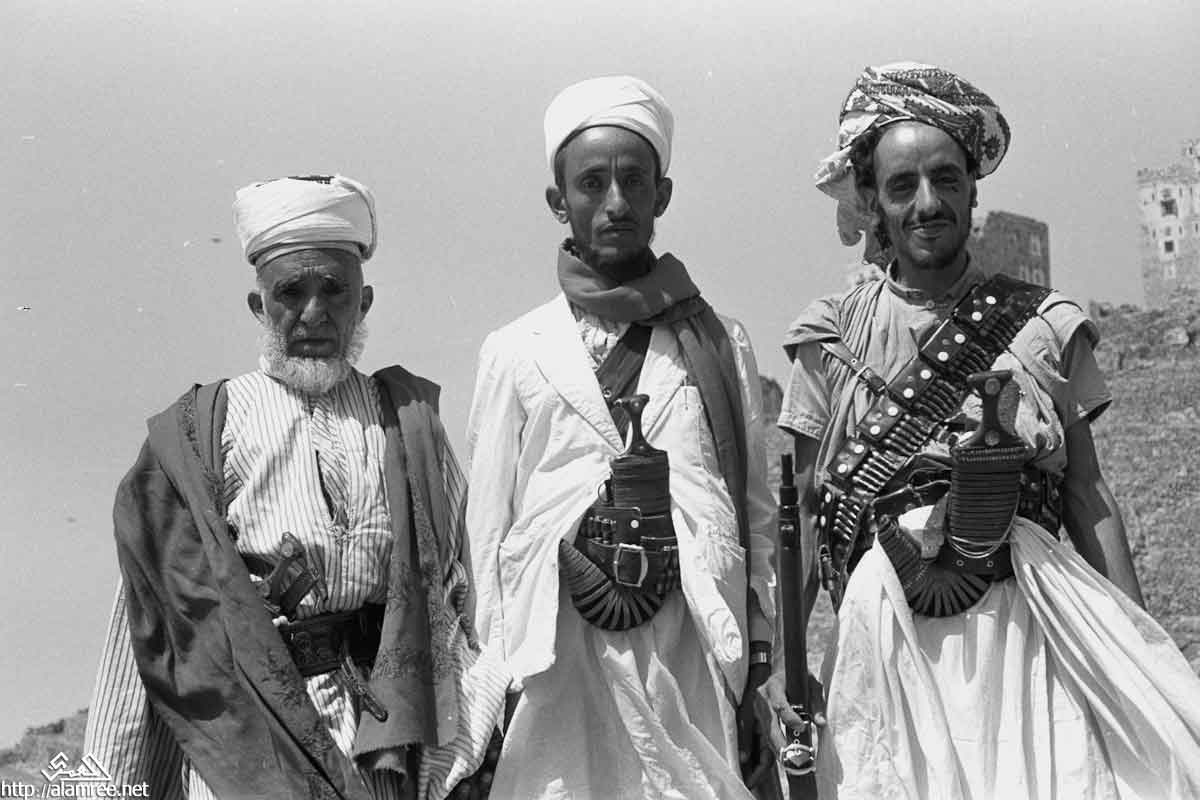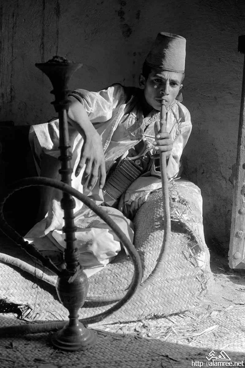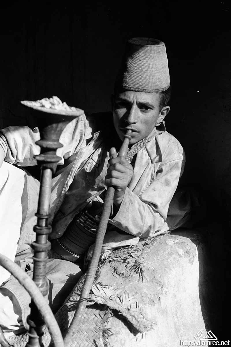 صورة لشاب، ويجلس على كرسي، وهو يرتدي قبعة مخروطية مضفورة (نموذجي للمنطقة تهامة اليمن)، وتدخين النرجيلة.