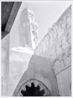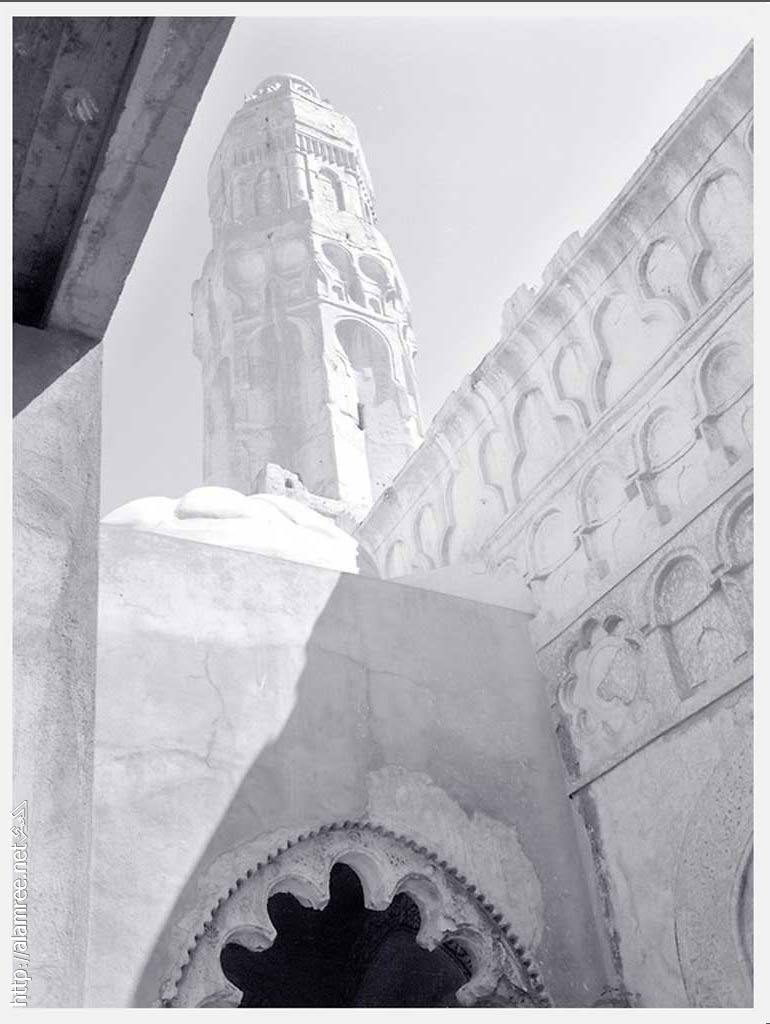 المئذنة وقاعدتها مرتفعة ثم تنبثق منها