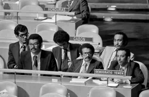 وفد اليمن الديمقراطي برئاسة محمد صالح مطيع (يمين) وزير الخارجية. يجلس بجانبه عبد الله صالح أشطل ، المندوب الدائم لدى الأمم المتحدة في 6