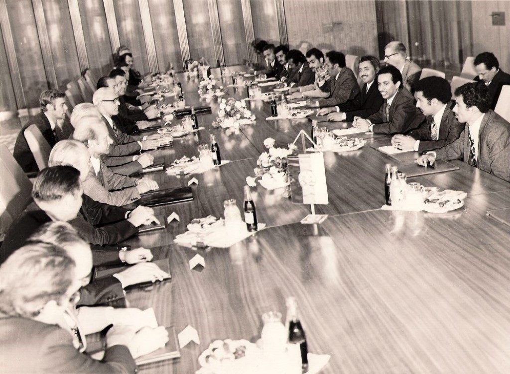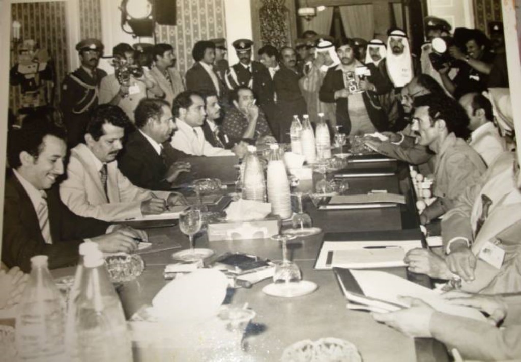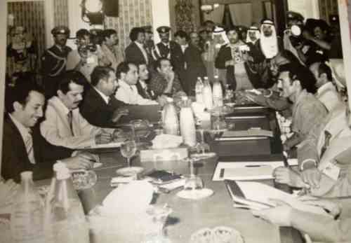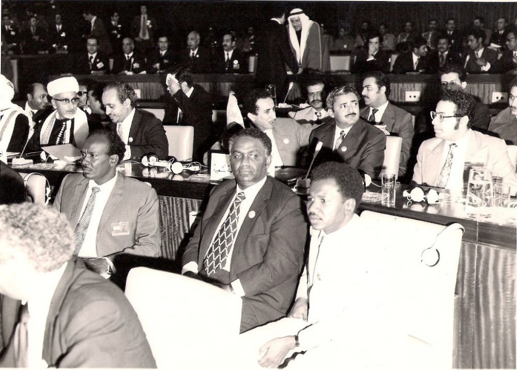 يظهر هنا وفد اليمن الديمقراطي برئاسة محمد صالح مطيع (يمين) وزير الخارجية.