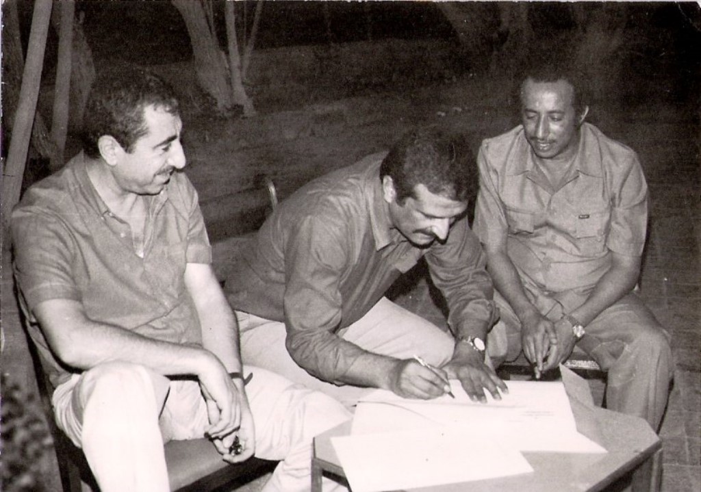 صالح مطيع مع صدام حسين والرئيس سالم ربيع