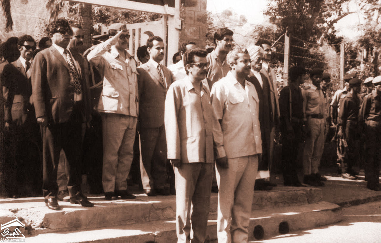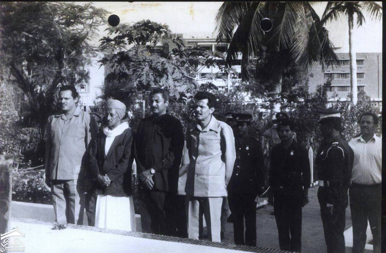 من يسار المشاهد علي ناصر محمد الشيخ عبدالله حاتم ، سالم ربيع علي ، عبدالفتاح اسماعيل في وقفة صمت امام النصب التذكاري للشهداء في التواهي عدن