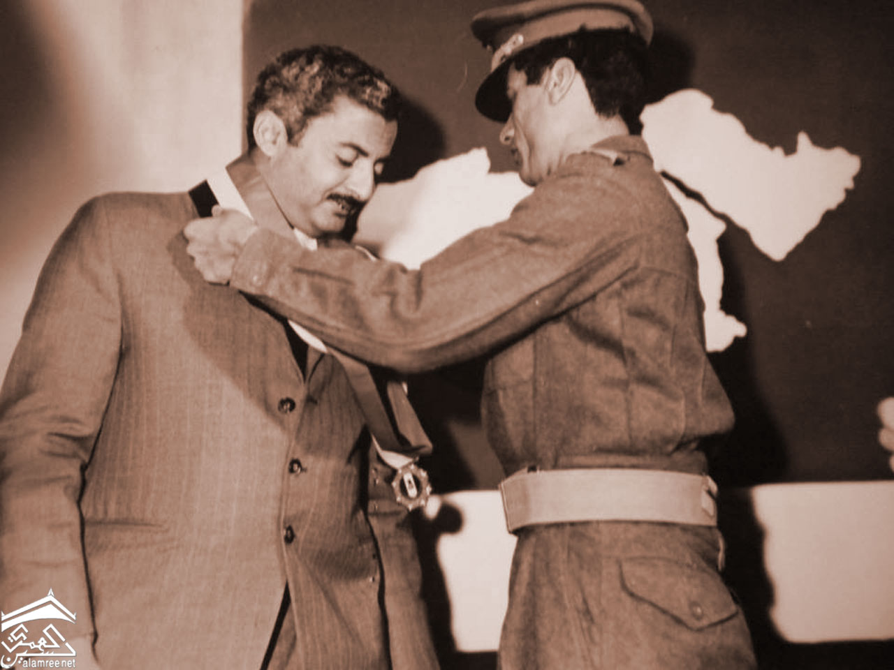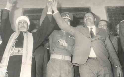 الرئيس سالم ربيع علي ومعمر القذافي وسط والقاضي عبدالرحمن الارياني رئيس المجلس الجمهوري في الجمهورية العربية اليمنية في طرابلس الغرب عام 1972م