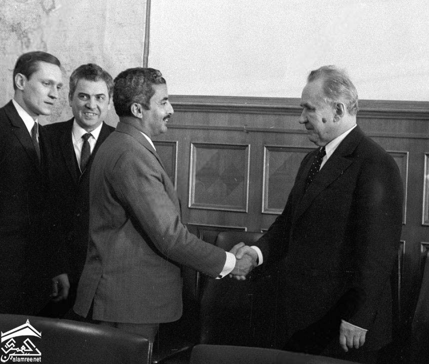 يرحب أليكسي كوسيجين ، عضو المكتب السياسي للحزب الشيوعي ، ورئيس مجلس وزراء الاتحاد السوفياتي (يمين) ، سالم ربيع علي ، رئيس جمهورية اليمن الديمقراطية الشعبية (اليمين الثالث) قبل المحادثات السوفيتية اليمنية في الكرملين