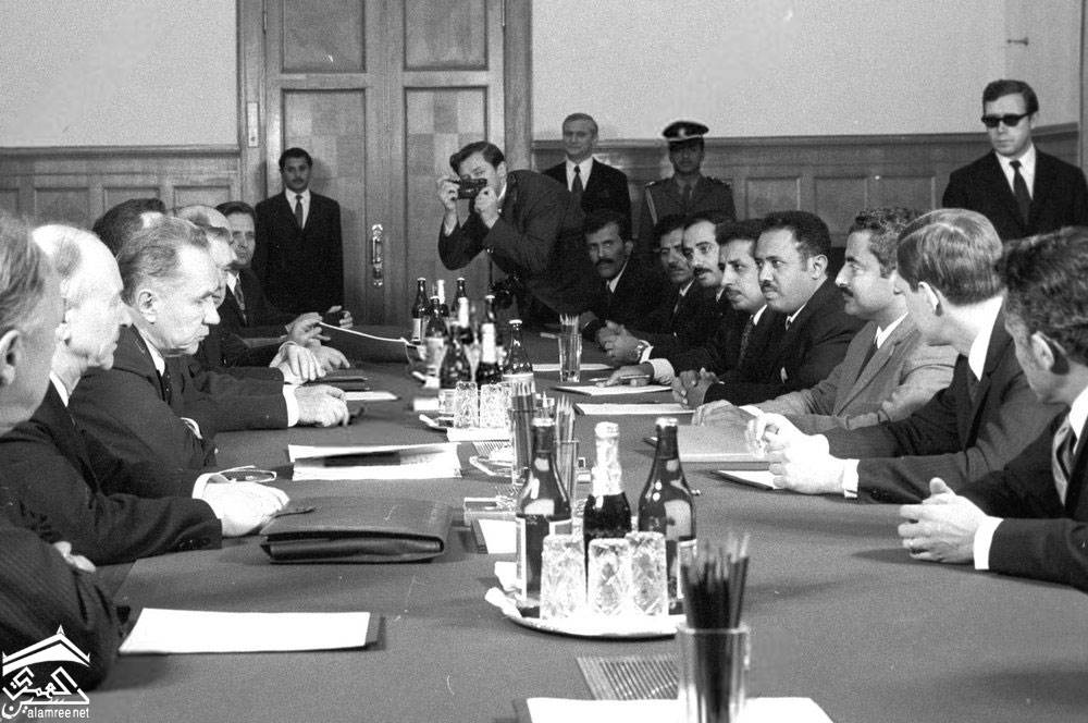 أليكسي كوسيجين ، عضو المكتب السياسي للحزب الشيوعي ، ورئيس مجلس وزراء اتحاد الجمهوريات الاشتراكية السوفياتية (اليسار الثالث) ، سالم ربيع علي ، رئيس جمهورية اليمن الديمقراطية الشعبية (ثالث يمين) خلال المحادثات الخاصة باليمن في الكرملين