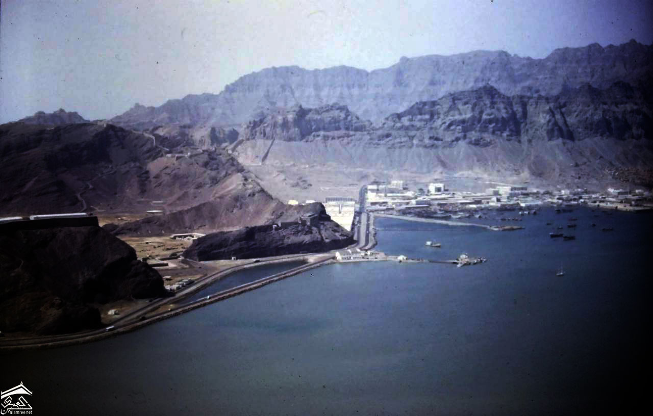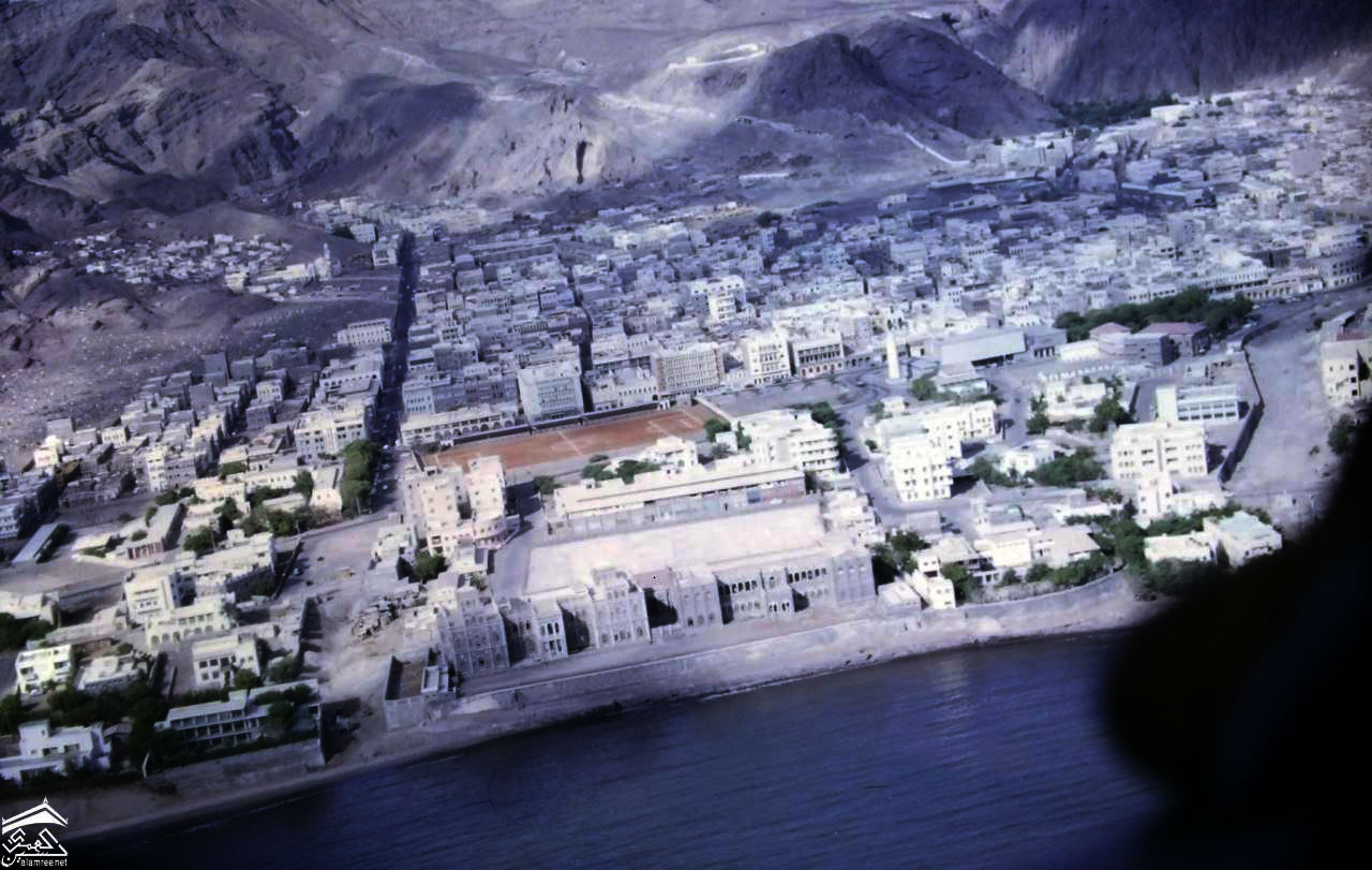 صورة جوية لميناء عدن التواهي للمصور سيدني جيمس جونسون حيث خدم في سلاح الجو الملكي البريطاني من عام 1947 إلى عام 1969. وفي عام 1963 تم تعيينه في سلاح الجو الملكي البريطاني في خورمكسر في عدن كمهندس وعضو في طاقم مروحيات بلفيدير ذات المحركين |