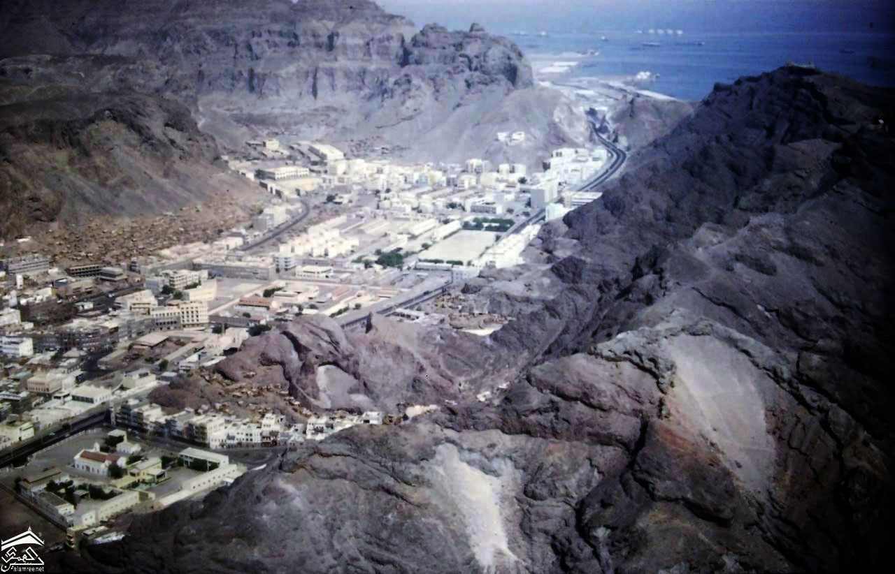 صورة جويه لميناء المعلا وفي الخلفية جبل شمسان يحتضن الشارع