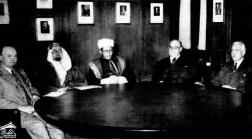 صوره في لندن اثناء افتتاح البث العربي من هيئة الاذاعة البريطانية  جالسين حول المائدة .. من اليسار إلى اليمين .. السير برنارد رايلي ، وزير المملكة العربية السعودية ، الأمير سيف الإسلام حسين ، وزير شؤون العراق والقائم بأعمال السفارة المصرية.
