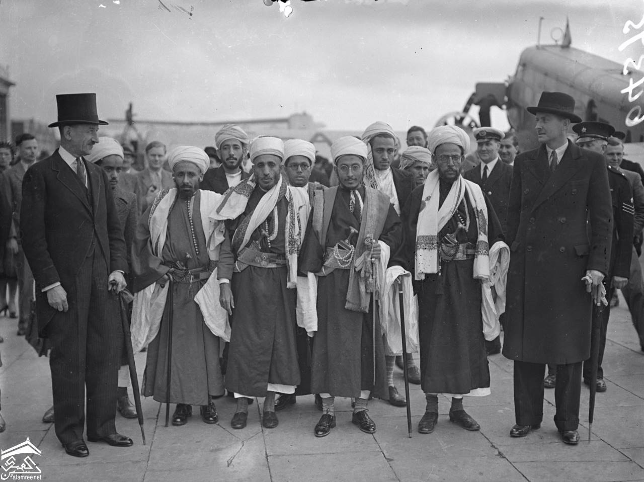 أمير اليمن وصل إلى إنجلترا للتتويج. لتمثيل والده ، ملك اليمن ، الأمير سيف الإسلام حسين وصل إلى كرويدون بطائرة خاصة. وقد استقبله العقيد كيني من وزارة الخارجية. تظهر الصورة: أمير اليمن مع العقيد كيني واعضاء الوفد المرافق له عند وصوله إلى كرويدون. 10 مايو 1937