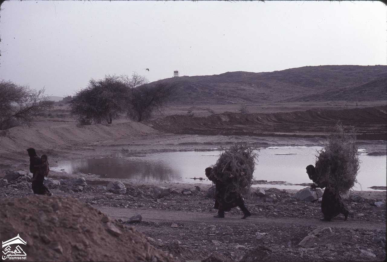 الحطابة في رداع ثلاث نساء يحملن الحطب على ظهورهن واحداهن تحمل طفل