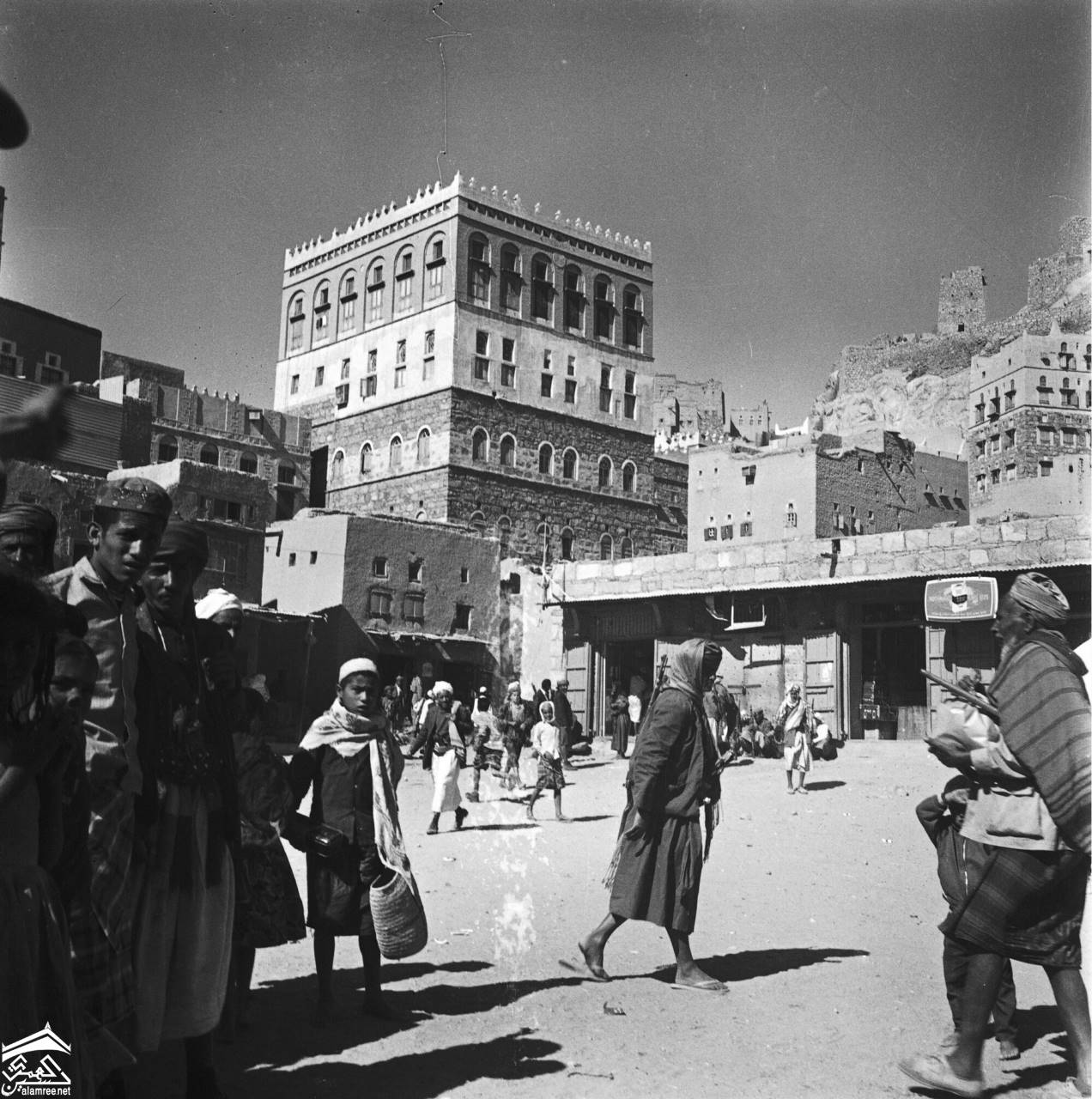 رداع ساحة السوق والقلعة. ساحة نابضة بالحياة في المقدمة ، منازل ، قلعة