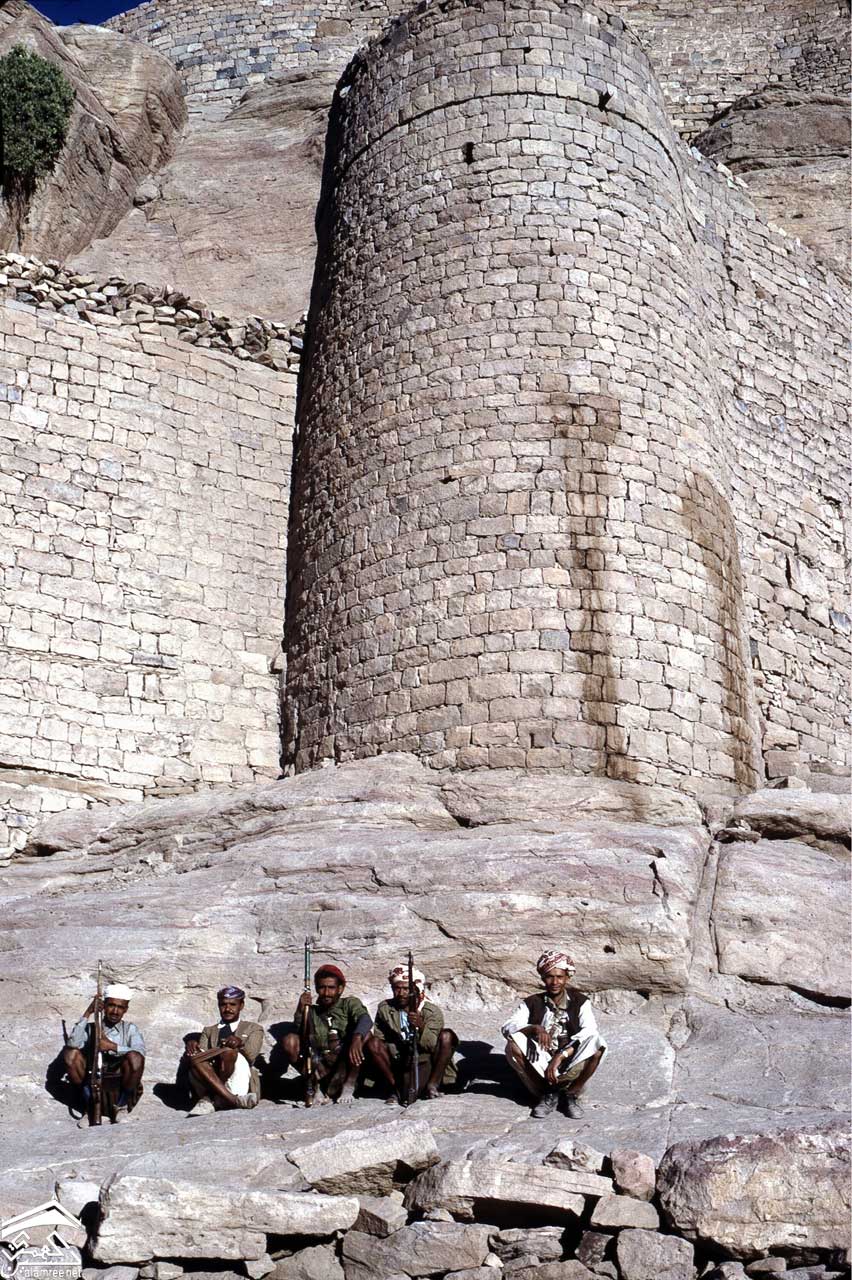 رداع. الحارس عند اسفل القلعة. مجموعة من الجنود جالسين على صخرة تحت برج