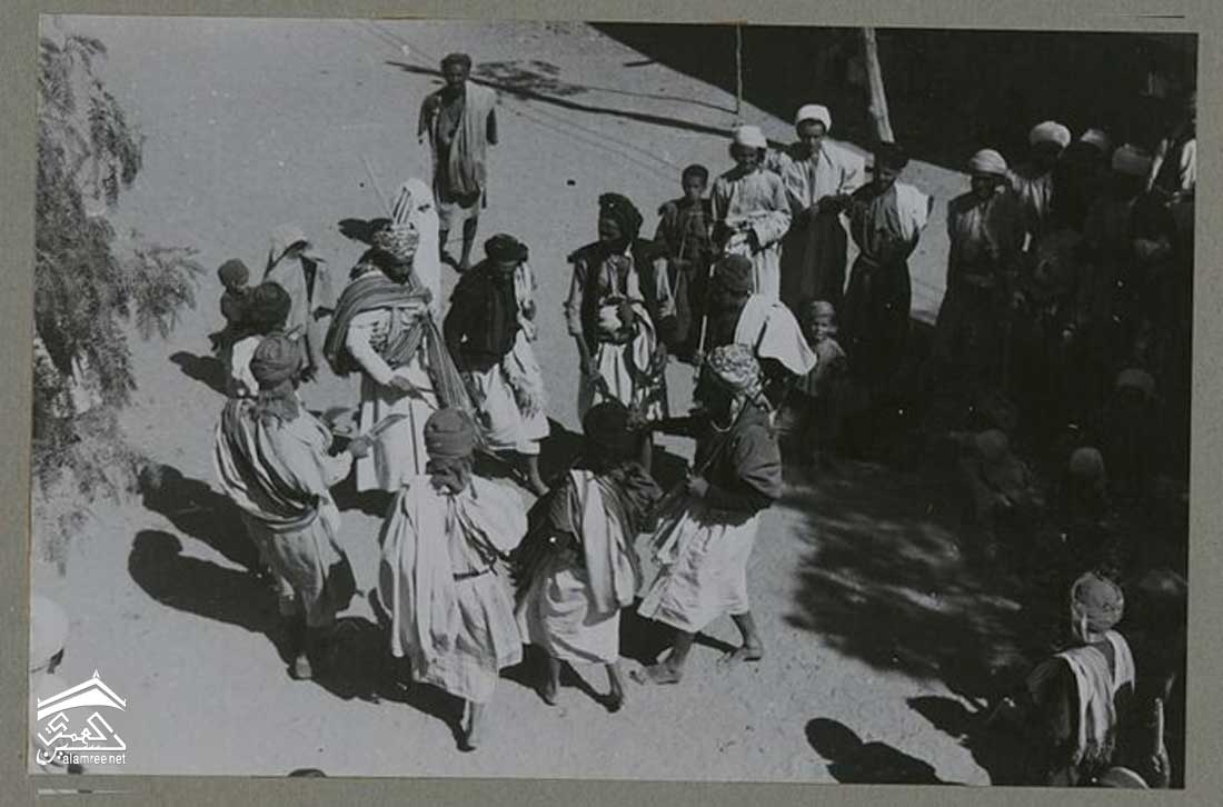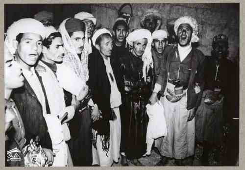 الراقصون الفلاحون وأصدقاء العريس ينتظرون خروج العروس من المسجد. الخناجر