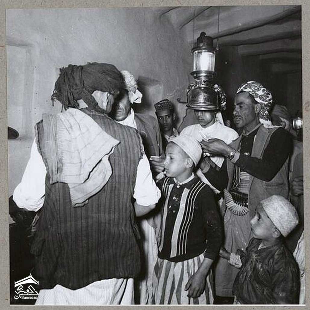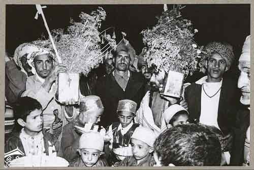 وبمناسبة حفل الزفاف يرافق العريس موكب من صالة الاستقبال الى المسجد والعكس. على رأس الموكب ، يرفع صبي شمعدانًا فضيًا صلبًا بسبعة فروع ، وهو تذكير غريب بوجود اليهودية في اليمن.