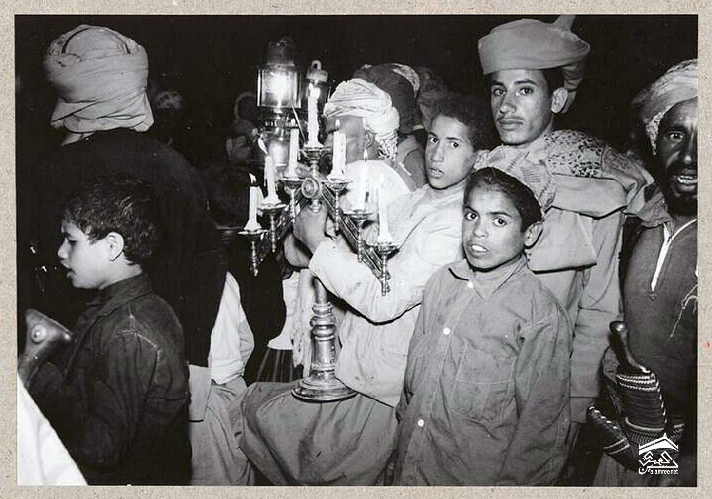 مصباحًا يعمل بالغاز البترولي ويمشي أمام الموكب. ينغمس الأولاد الصغار