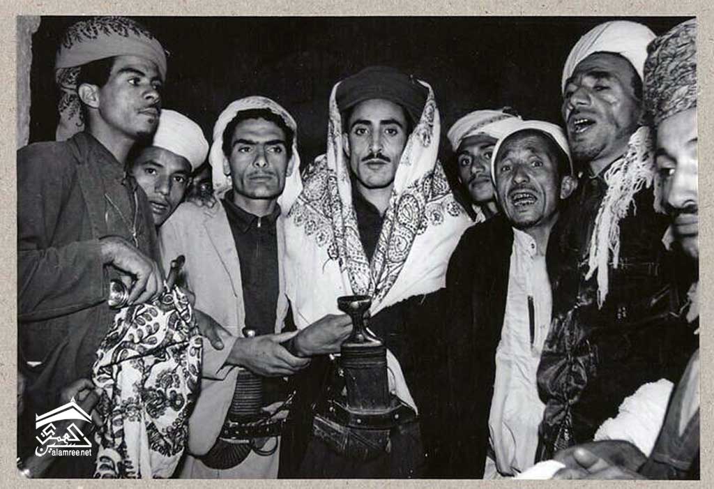 العريس اليمني مؤطر من قبل الأصدقاء الذين يمسكونه من الذراعين ؛ يلبس شعره بطريقة معينة: شال يغطي رأسه وأذنيه وكتفيه. على يسار العريس المطرب الذي يرافق أغانيه الموكب الذي ينطلق من بيت العريس إلى المسجد لصلاة العشاء ، والعكس صحيح.