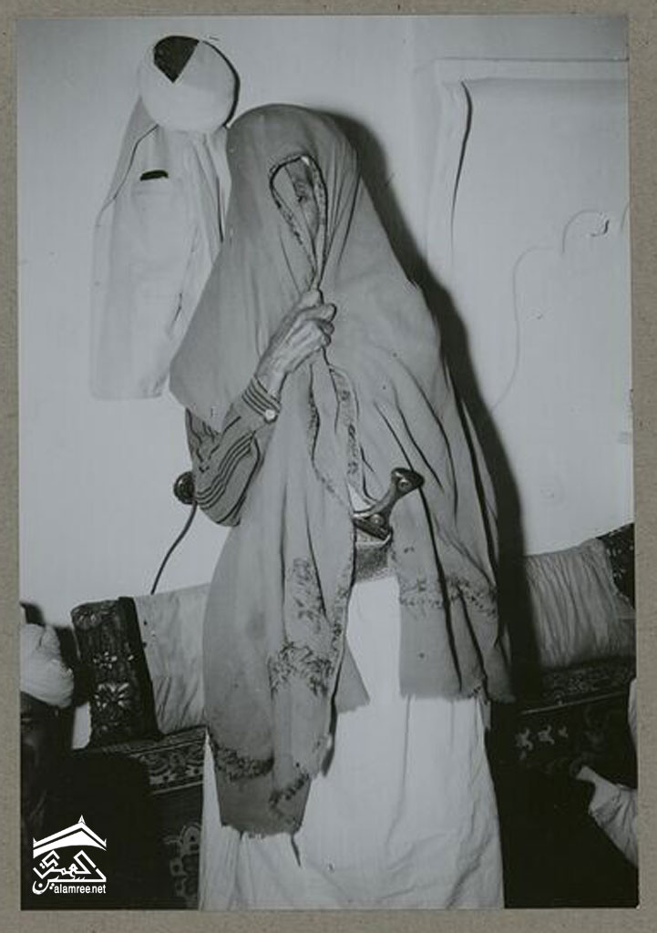 يوم زفافة فان يعطي الجزء العلوي من جسمه بالشال وتترك فتحة صغيرة في هذا الحجاب ليرى بعين واحدة ويفضل اليسرى