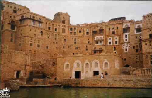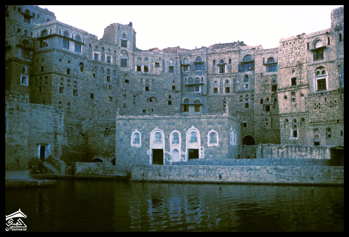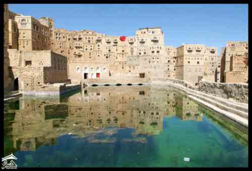 اليمن – الحبابة – واجهات منازل تطل على صهريج في المركز التاريخي