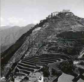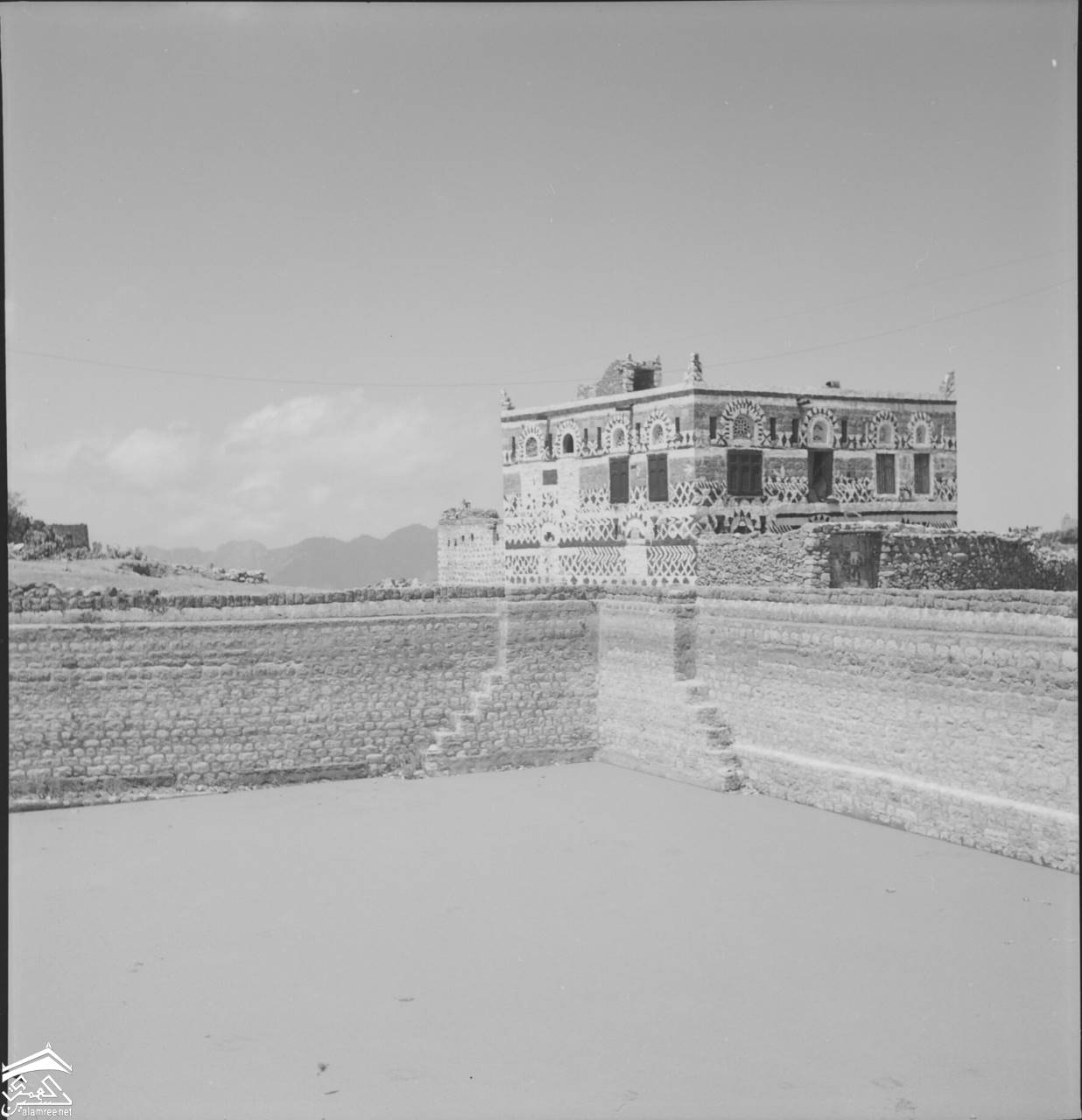 شمال اليمن. حجة. الوالي والصهريج. [منظر جبلي به تراسات ومبنى].