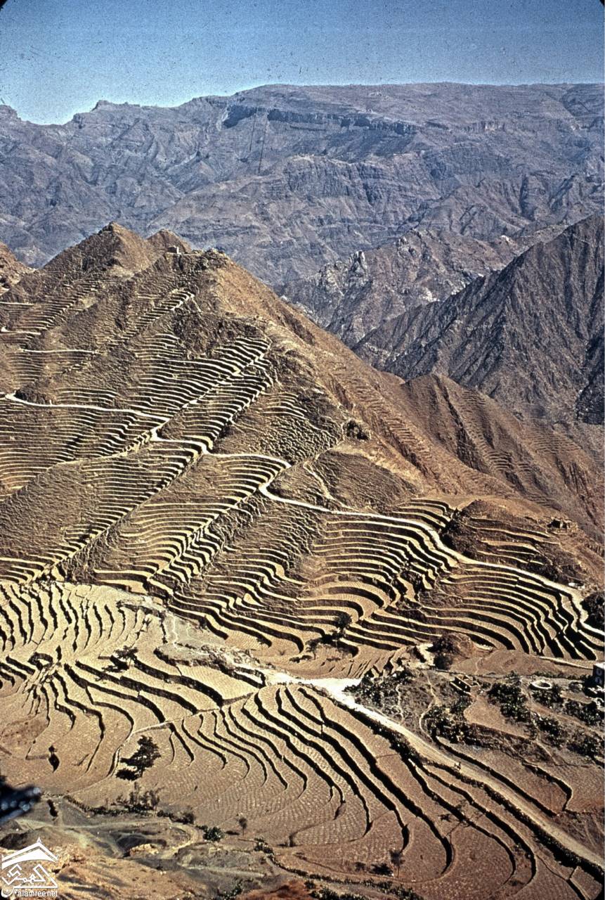 منظر عام لمدينة حجة. [الإنشاءات على الجبل والزراعات في المصاطبعام 1972 لدومنيك شامبوت]. ].
