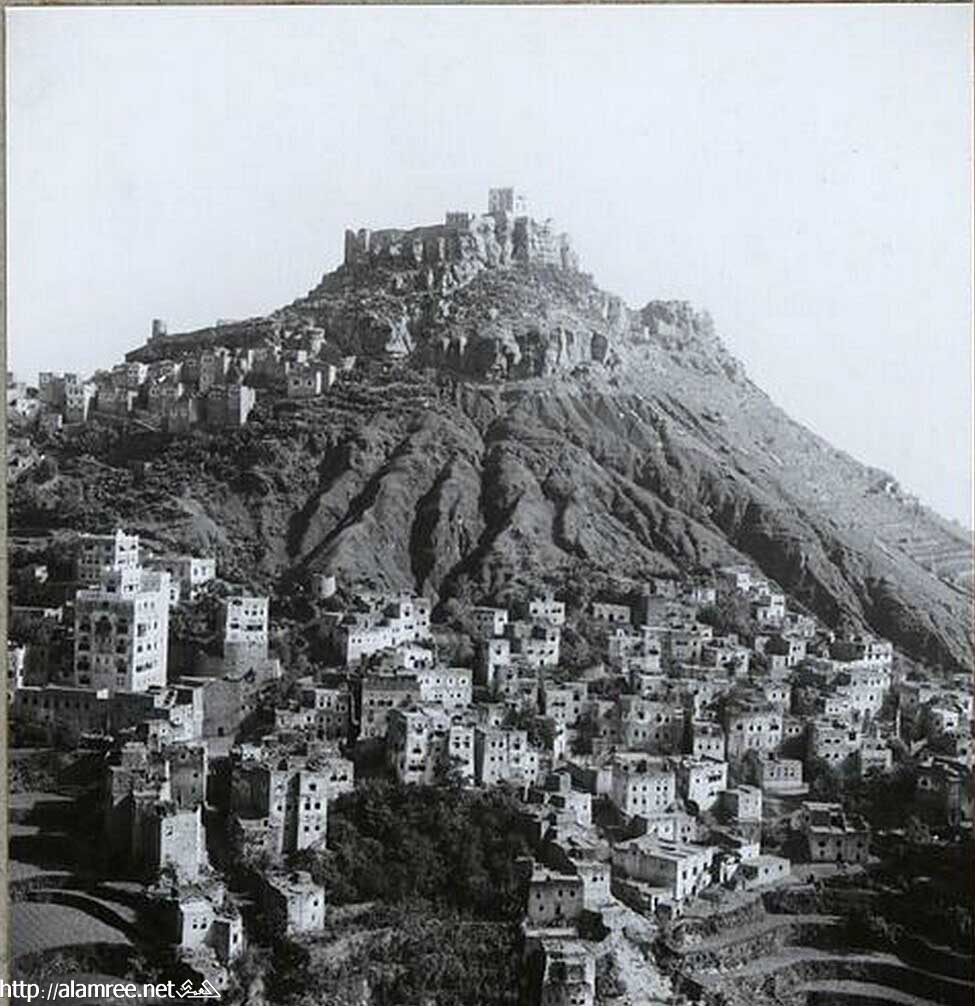 مدينة حجه شمال غرب صنعاء ترتفع 2500 متر فوق مستوى سطح البحر وكانت ذات يوم معقلا للامامه الكهنوتية وتهيمن عليها قلعتها الهائله التي كانت تستخدم كسجن للاحرار اليمنيين الصورة للمصور جوزيف شلهود عام 1956م |
