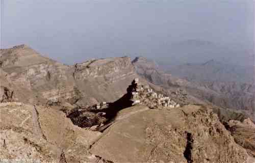 منظر لقلعة القاهرة والقصر القديم بحجة. تم بناء التحصينات على سفح الجبل شديد الانحدار، ويظهر في الأعلى مبنى، وهو جزء من القصر القديم. تظهر مستوطنة أخرى على قمة تل إلى اليسار، مع مصاطب متدرجة تملأ المنحدرات الخضراء شديدة الانحدار. الجبال ترتفع في المسافة