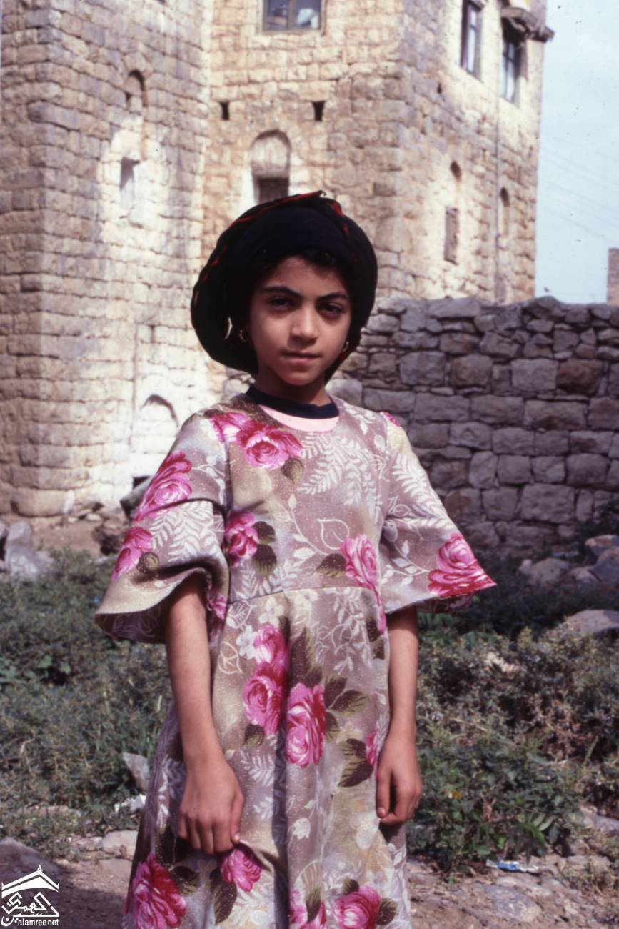 منظر عبر حجة، مع مجموعة من الأطفال يجلسون على نتوء في المقدمة. ترتفع منحدرًا إلى اليمين بعض تحصينات قلعة القاهرة التي تحيط بالقصر. أمامك مباشرة توجد مستوطنة على قمة تل، بها شرفات متدرجة تغطي منحدرات خضراء شديدة الانحدار. تظهر مستوطنة أخرى في واد عميق على يسار الصورة. الجبال ترتفع في الخلفية. تتكون مجموعة الأطفال من تسعة فتيان وفتيات بأعمار مختلفة