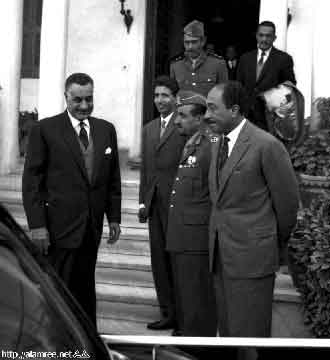 الفريق حسن العمري والرئيس عبالله السلال اثناء استقبالهم من قبل جمال عبدالناصر وانور السادات